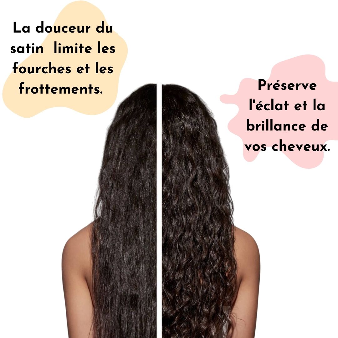 Favorise la croissance des cheveux Si vous êtes de celles qui aimerez avoir plus de longueur, le secret est de maintenir les longueurs et évite un maximum la casse et la solution d’attacher vos cheveux avec des chouchou en satin et finir par porter nos bonnets en satin tout a long de son sommeil,